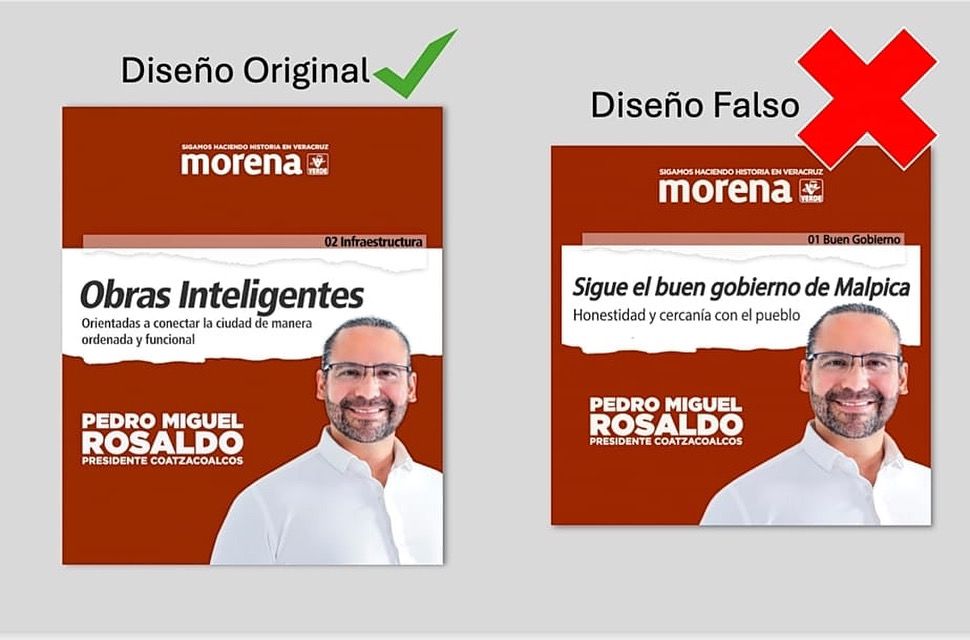 El desmentido muestra el diseño original y el que está modificado maliciosamente con un texto que no corresponde con las propuestas del Candidato.